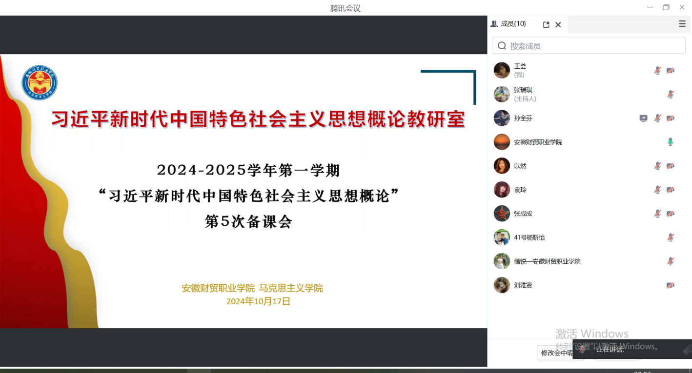 10月17日晚上,习近平新时代中国特色社会主义思想概论教研室召开线上第五次集体备课会,马克思主义学院院长张少兵及全体授课教师参加。