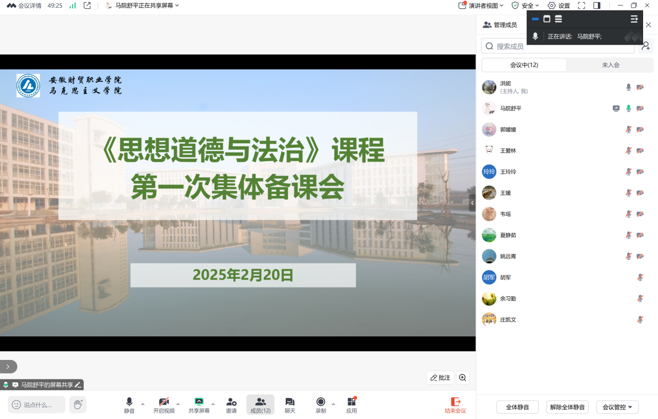 2月20日晚上,思想道德与法治课程组在线上举行了“思想道德与法治”课程第一次集体备课会。备课会由课程教研室主任洪妮主持,思想道德与法治课程组全体教师参加。