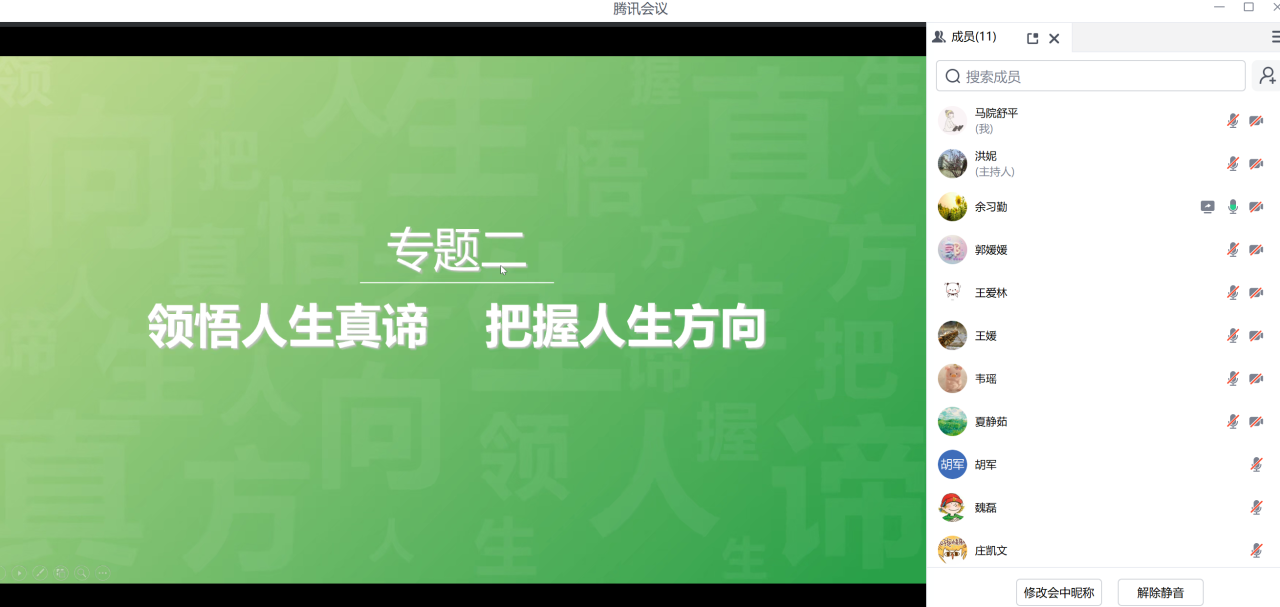 2月27日,思想道德与法治课程组第二次集体备课会在线上举行,备课会由教研室主任洪妮主持,课程组全体教师参会。
