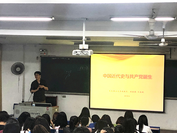 在讲述共产党诞生及中共一大时,王良斌着重介绍了我党早期两位著名的领袖人物陈独秀和李大钊,强调了今天幸福生活的来之不易,希望同学们珍惜时光,牢记历史,不忘初心,做一名新时代的优秀青年。(供稿:校园记者李伟杰 陈国影 审稿:王丽)