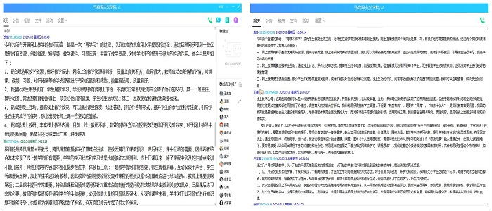 2020年5月8日,马克思主义学院结合教务处教学督导反馈及部门督导组的听课情况,在全体教师中发起了线上教学体会大讨论,剖析半学期以来线上教学的成效,分享体会和收获。 马克思主义学院副院长王良斌在发布交流要求时强调,突如其来的疫情倒逼我们的教学模式,也激发了我们对线上教学更多的思考和尝试,老师们要认真梳理半个学期以来的线上教学的进展情况,提炼心得,总结方法,反思成效,通过此次交流同事之间取长补短,务必将课程的育人目标落到实处。