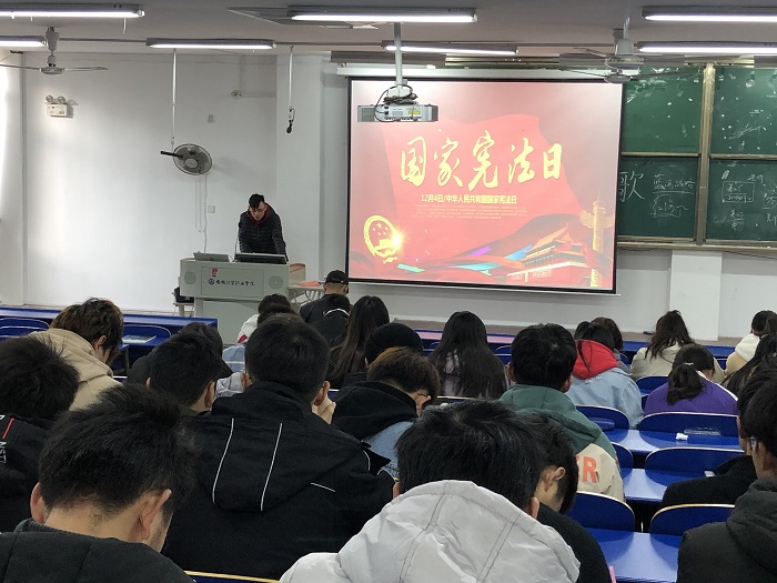 2019年12月4日是全国第六个宪法日,在这前后,马克思主义学院结合“思想道德修养与法律基础”课程第六章尊法学法守法用法知识点和“经济法”课程相关知识点举办“宪法日”主题教育课堂,魏磊、侯青云、江艳、卢言言、洪妮、张瑞琪等老师利用课堂实训的形式,引导学生尊法学法守法用法,做社会主义法治的忠实崇尚者、自觉遵守者、坚定捍卫者。 在课堂上,洪妮老师为同学们解读了第六个宪法日的主题“弘扬宪法精神、推进国家治理体系和治理能力现代化”,阐述了习近平新时代中国特色社会主义思想,习近平总书记全面依法治国的新理念、新思想、新战略,党的十九大和党的十九届四中全会精神,重点宣讲了宪法的地位、作用和主要内容,我国法治建设的辉煌成就和社会主义核心价值观。部分同学回顾了宪法历次修订完善的历史沿革过程,明确了宪法作为国家根本法的重要地位,汇报了自己学习宪法与相关法律的心得。江艳老师在课堂中还组织同学们模拟了宪法宣誓,以庄严的仪式感强化同学们的宪法意识。
