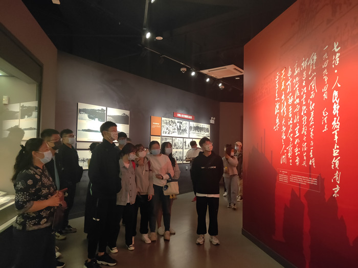 陈列分为“革命赓续 安徽建党”、“红色沃土 红军摇篮”、“华中砥柱 铁军战歌”和“江淮鏖兵 革命胜利”等四个部分。沿陈列时间和路线,徐明教授依次向同学们介绍了近代安徽地区新民主主义革命历程、安徽地区重大革命历史事件以及重要革命人物的英雄事迹。通过参观大量珍贵的图片、文献、影像资料以及丰富的多媒体手段,使得全体同学对于那个烽火连天的战争年代,为了国家富强和民族独立,无数江淮儿女前赴后继的奋斗历程和杰出贡献有了更深层次的学习和认知。