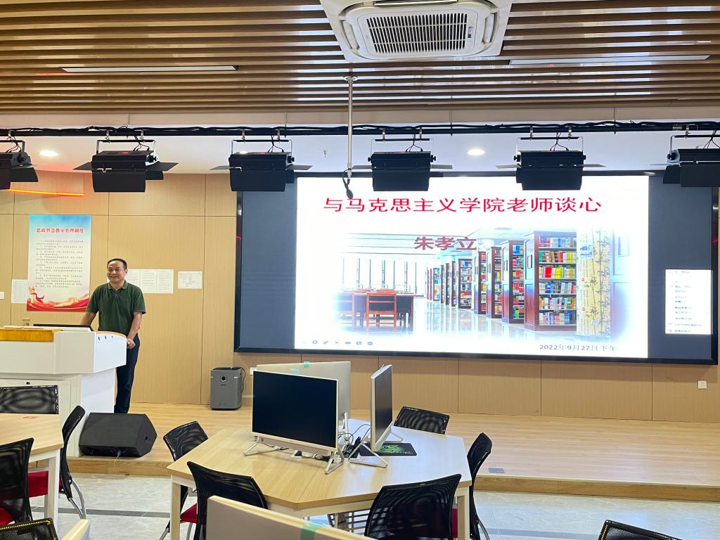 9月28日下午,马克思主义学院在智慧实训室举办“博士论见”活动第二期。报告会邀请到主讲嘉宾朱孝立博士,题目为《与马克思主义学院老师谈谈心》,马克思主义学院副院长崔学明主持报告会。
