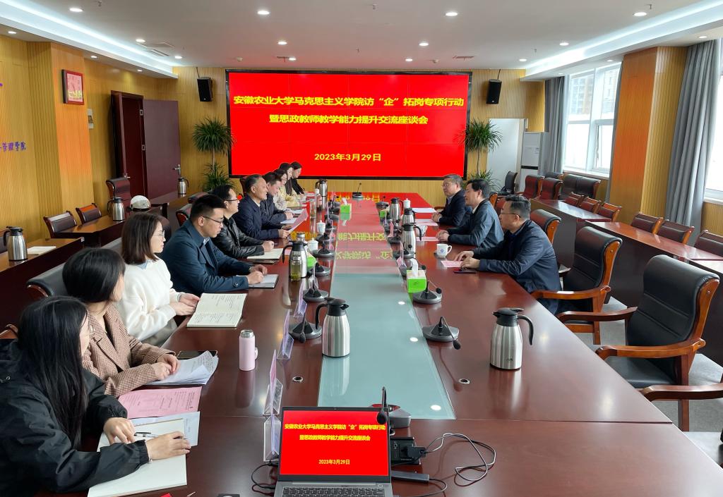 3月29日上午,安徽农业大学马克思主义学院党委书记孙超,党委副书记、院长方国武,党委副书记、纪委书记、副院长袁修雨一行到校调研交流。学校党委书记张志祥出席会议,马克思主义学院负责人及相关教师参加座谈会。