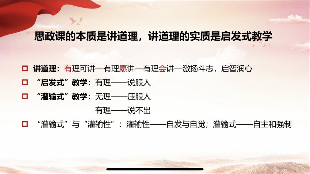 本期周末理论大讲堂内容丰富,为思政课教师提供了思想交流和理论提升的契机,为思政课教师在今后的教学实践中将思政课讲深、讲透、讲实、讲活提供了有意义、有价值的理论遵循,打开了以问题为导向开展思政课启发式教学的大门。
