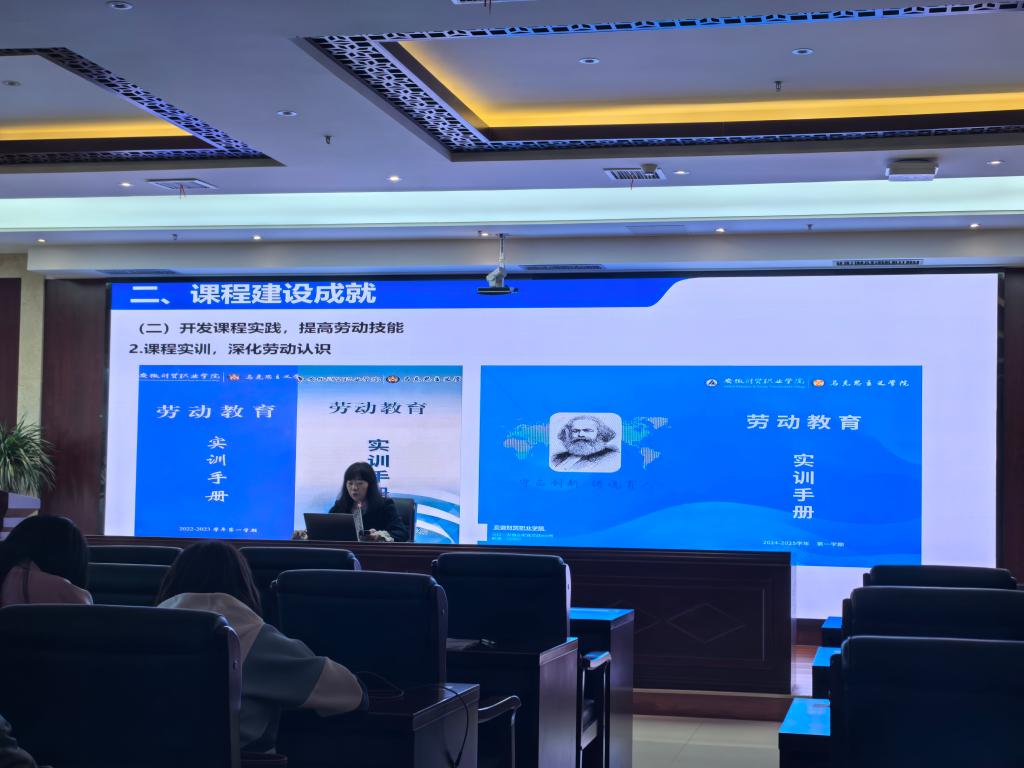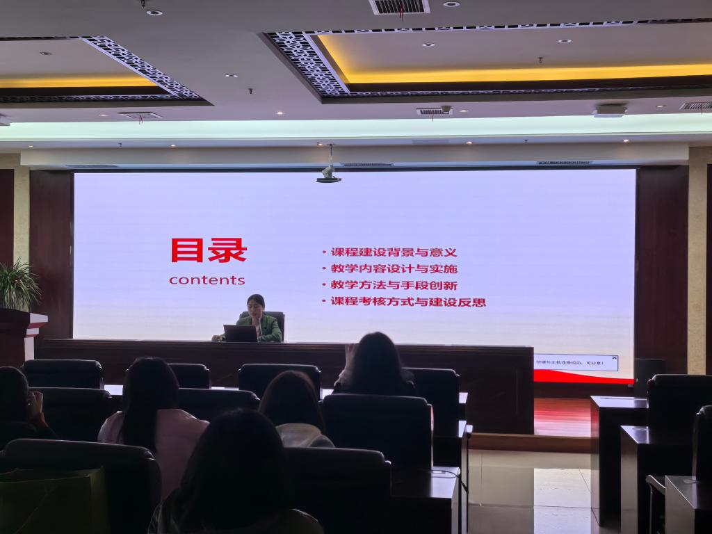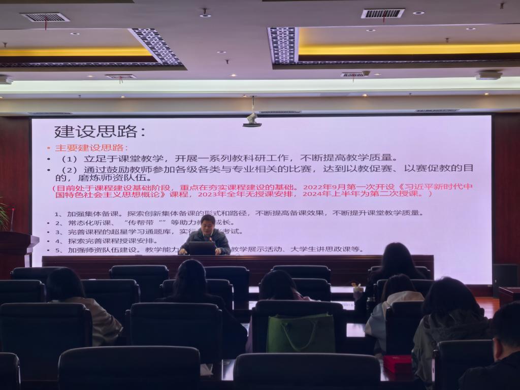 会上,各教研室从课程建设整体思路、重点难点、特色做法、阶段性成果及成效等方面进行汇报交流,介绍了课程建设的思路策略、实践探索等。毛泽东思想和中国特色社会主义理论体系概论教研室教师包越从课程建设背景与意义、教学内容设计与实施、教学方法与手段创新、课程考核方式与建设反思四个方面汇报了《党史国史》课程建设情况。思想道德与法治教研室主任洪妮介绍了《劳动教育》《职业生涯规划》《思想道德与法治》三门课程的总体建设情况并系统总结了建设成果、分析了不足。习近平新时代中国特色社会主义思想概论教研室主任张瑞琪围绕本教研室课程的建设内容、建设成就、继续建设对策及想法等方面进行了汇报。