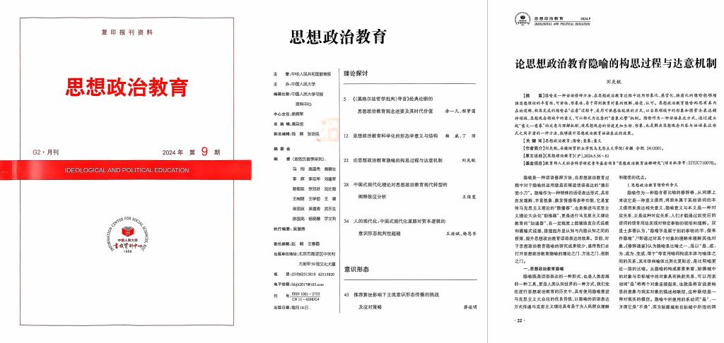 该期刊本次共收录10篇学术文章,刘先锐文章聚焦思想政治教育隐喻的构思过程以及达意机制进行纵深性探索,认为隐喻作为一种话语修辞方法,在思想政治教育过程中运用形象化、感官化、物质化的隐喻能够增强思想理论的丰富性、可讲性、形象性,易于得到教育对象的理解、接受、认可。文章指出思想政治教育隐喻构思有其内在的逻辑,构思完成的隐喻在“达意”过程中,是用可供感性关照的方式,以自然领域中的形象和图景去表达精神领域、思想观念领域中的意义,可以称之为达意的“意象比譬”机制。文章认为,隐喻作为一种话语表达方式,是解决思想观念内容与话语表达形式之间矛盾的一种方法,能够提升思想政治教育话语表达的效果。