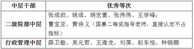 根据学院《关于做好2020年度部门工作绩效考核和教职工年度考核工作的通知》(院政发〔2021〕10号)、《beat365在线唯一官网部门工作绩效考核办法》(院党发〔2021〕12 号)和《beat365在线唯一官网教职工年度考核办法》(院党发〔2021〕13号),依据各考核评议单位最终考核成绩排序结果,经2021年4月21日学院年度工作考核领导小组会议研究确定、4月23日学院第7次党委会研究审定,现将2020年度部门工作绩效考核和教职工年度考核优秀等次名单予以公示(名单顺序按最终考核成绩排序)。