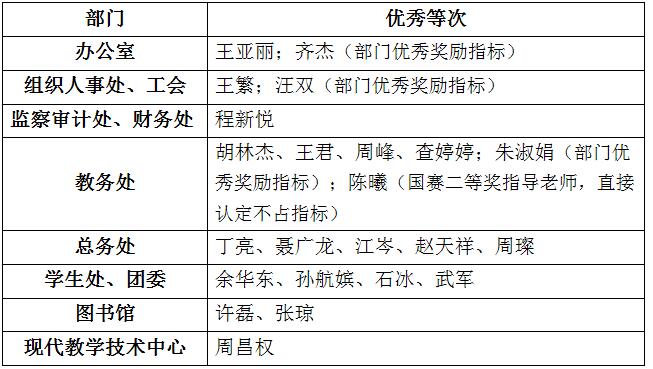 学院对工作绩效考核为优秀等次的部门,授予“先进集体”荣誉称号,奖励部门教职工年度考核优秀指标,其中教学部门各奖励2名、管理部门各奖励1名。