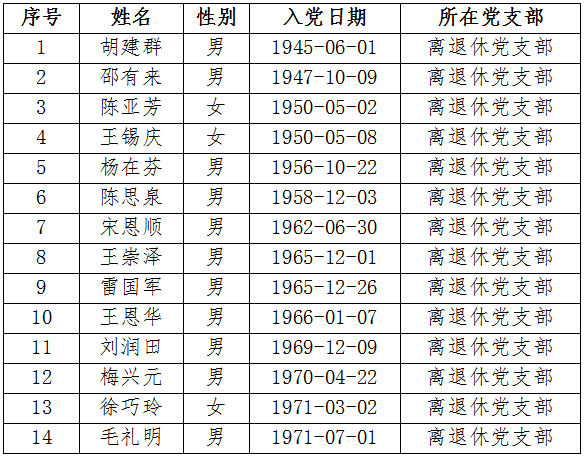 根据中共中央办公厅印发《关于做好“光荣在党50年”纪念章颁发工作的通知》,党中央决定,2021年首次颁发“光荣在党50年”纪念章,这项工作是中国共产党成立100周年庆祝活动的重要组成部分,对于增强党员的荣誉感、归属感、使命感,汇聚全党为实现“十四五”规划和2035年远景目标持续奋斗的磅礴力量,具有十分重要的意义。首次颁发对象,是健在的、截至2021年7月1日党龄达到50年、一贯表现良好的党员。根据省社机关党委通知要求,现将我校“光荣在党50年”纪念章颁发对象公示如下(按入党时间排序)。