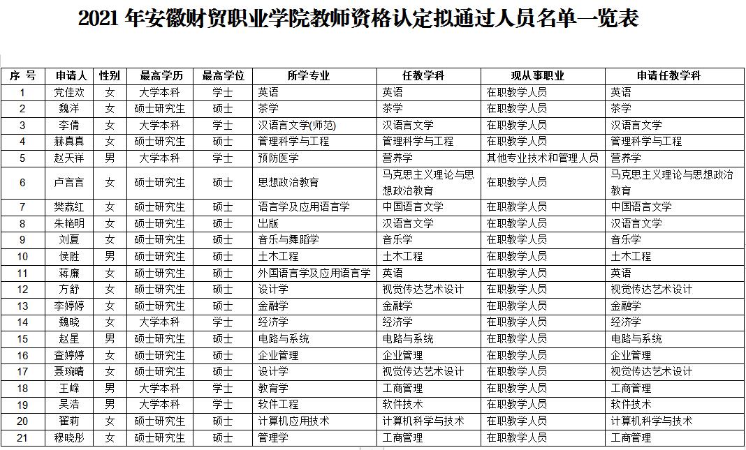 根据《安徽省教育厅关于做好 2021 年高等学校教师资格认定工作的通知》(皖教秘人〔2021〕73 号)、《关于做好 2021 年高等学校教师资格认定工作的通知》(组发〔2021〕21 号)等文件精神,经网上报名、现场确认、教育教学基本素质和能力测试等工作程序,现将2021年学院教师资格认定初审合格人员予以公示,具体名单附后。