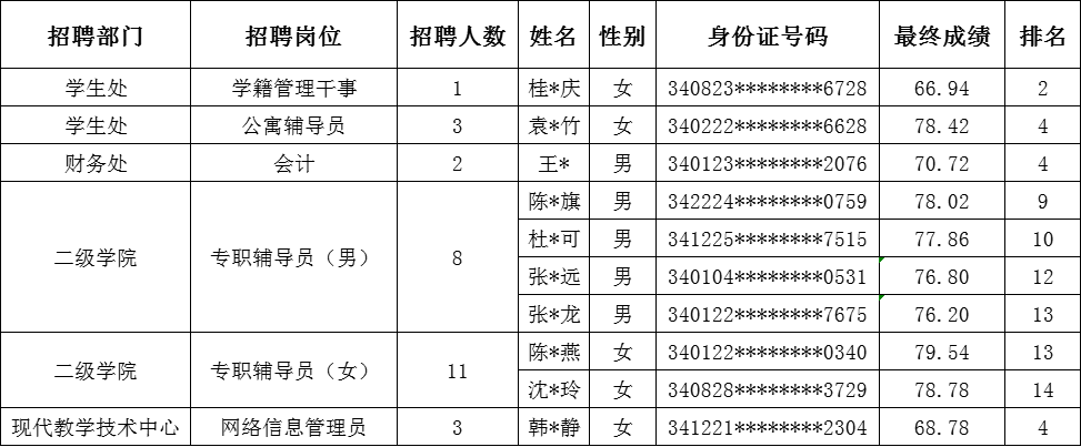 2021年度学院公开招聘聘用制人员资格复审阶段因考生放弃资格复审或资格复审不合格等原因,学籍管理干事(201223)、公寓辅导员(201224)、会计(201225)、专职辅导员(男)(201228)、专职辅导员(女)(201229)、网络信息管理员(201233)等6个岗位共缺额10人。
