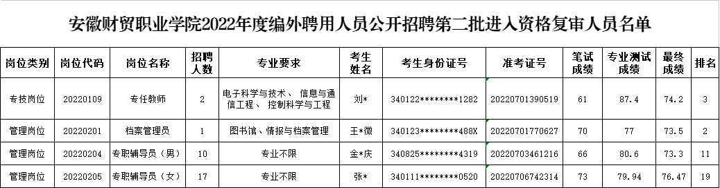 在学院2022年度编外聘用人员公开招聘资格复审阶段,因考生放弃资格复审或资格复审不合格等原因,专任教师(20220109)、档案管理员(20220201)、专职辅导员(男)(20220204)、专职辅导员(女)(20220205)等4个招聘岗位共缺额4人。