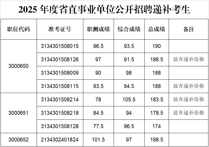 根据《beat365在线唯一官网2025年度省直事业单位公开招聘工作人员进入资格复审人员的通知》,3000650、3000651和3000652岗位因考生资格复审不通过或放弃资格复审等原因出现人选缺额,现按照笔试成绩从高分到低分,依次等额递补(笔试成绩须达到最低控制合格分数线,并且每科成绩不低于60分),最后一名如有数名考生笔试成绩相同,一并进入资格复审环节。