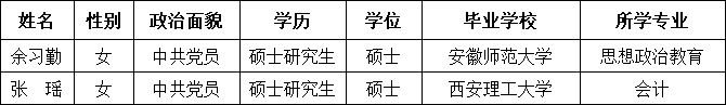 根据《beat365在线唯一官网博士人才引进公告》《beat365在线唯一官网2022年度高层次和紧缺专业人才引进预公告》等相关要求,按照《beat365在线唯一官网高层次人才引进与培养管理办法(修订)》等文件精神,通过试讲考核、资格复审、体检政审等考察程序,经学院党委会研究决定,同意安置引进博士刘先锐同志配偶工作,聘用余习勤同志为马克思主义学院专任教师;同意安置引进博士黄放同志配偶工作,聘用张瑶同志为财会金融学院专任教师。人员基本信息如下。