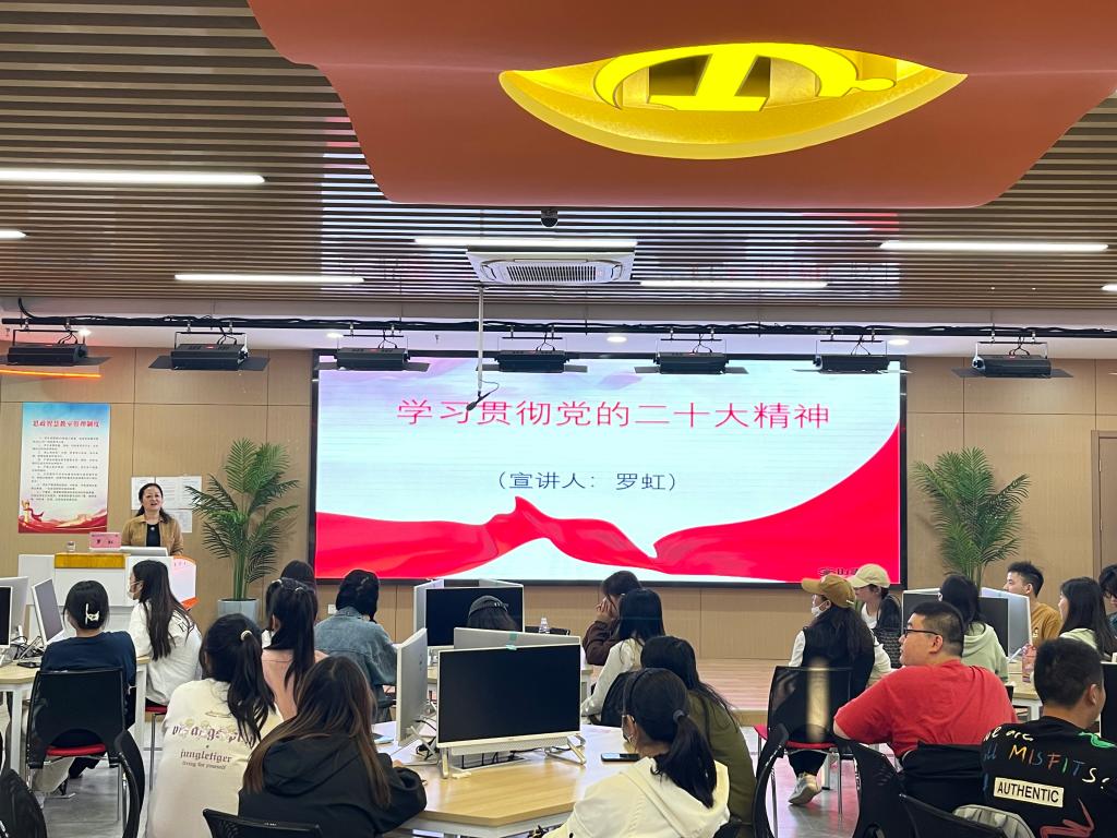 党委委员、纪委书记罗虹以《学习贯彻党的二十大精神》为主题,宣讲了党的二十大作出的一系列战略部署,勉励财贸学子争做勇于担当的新时代奋进者。