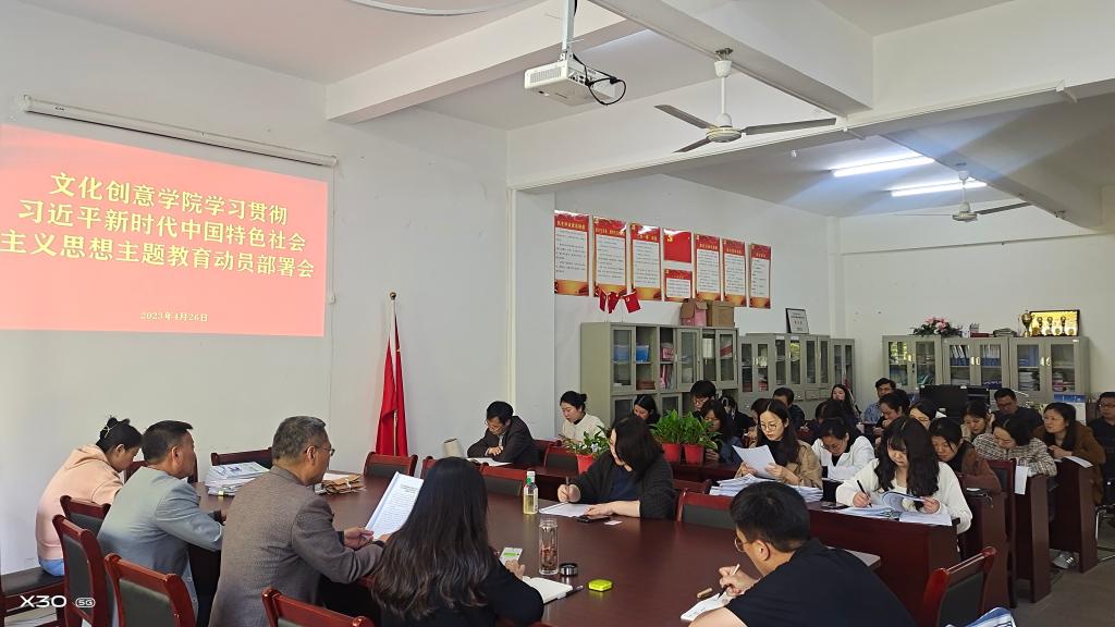 4月26日下午,文化创意学院开展学习贯彻习近平新时代中国特色社会主义思想主题教育动员部署会。党总支书记张克主持会议,院长郭湘如、副院长高静、党总支副书记宋凌云以及全体教师参加会议。