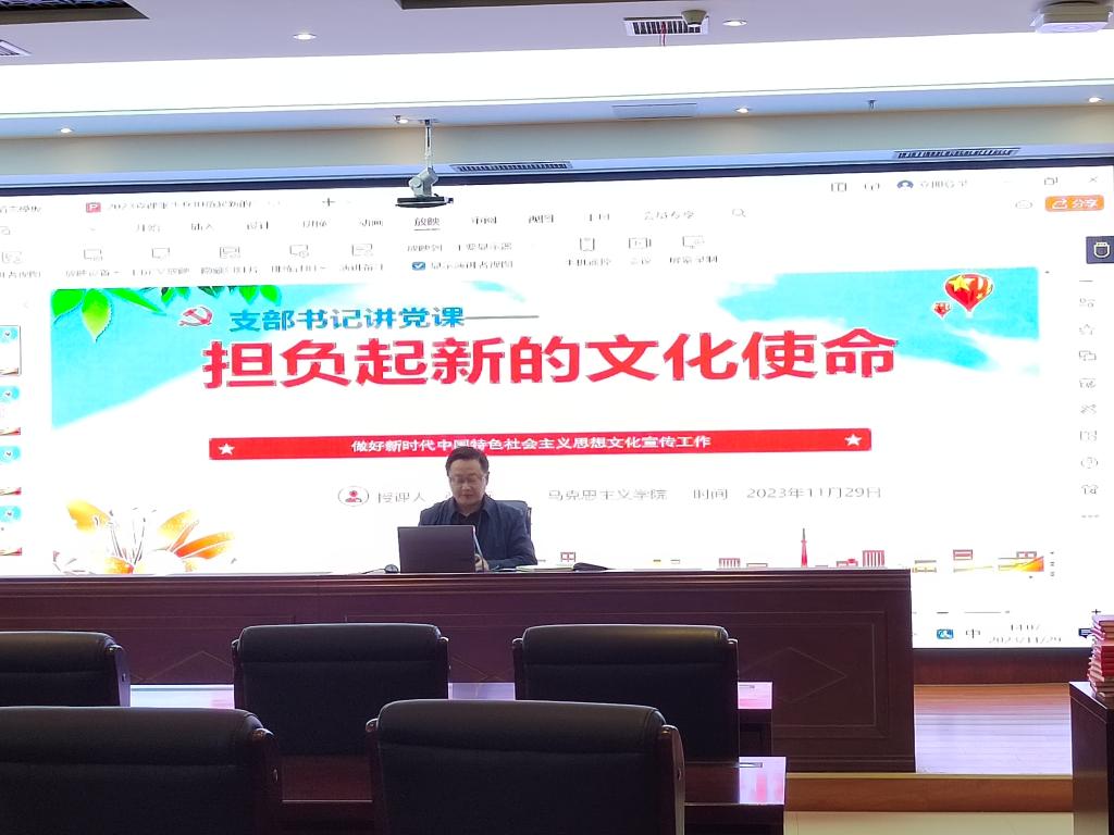 为深入学习贯彻习近平文化思想,做好习近平新时代中国特色社会主义思想文化宣传工作,11月29日下午,马克思主义学院在行政楼311会议室开展支部书记讲党课,本次党课由马院党总支副书记张少兵主讲,支部全体党员同志参加。