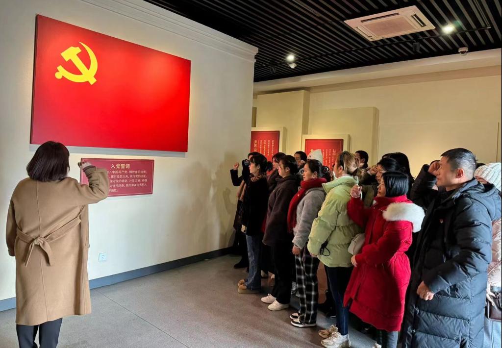 参观结束后,在展览馆东大厅,进行了老党员为新转正党员佩戴党员徽章仪式,并由第一党支部书记宁蓓带领全体成员重温入党誓词。