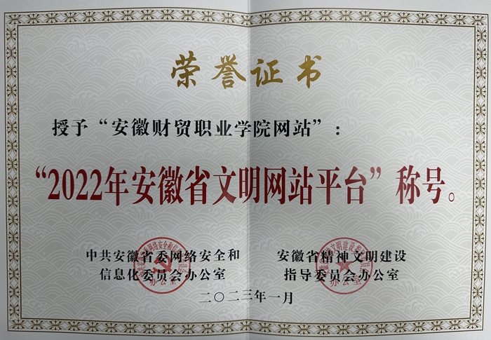 近日,省委网信办、省文明办发布2022年度安徽省文明网站平台评选结果,我校网站被授予“2022年安徽省文明网站平台”称号。此次评选中全省仅2所高校获评该荣誉,我校网站是唯一高职院校网站平台。