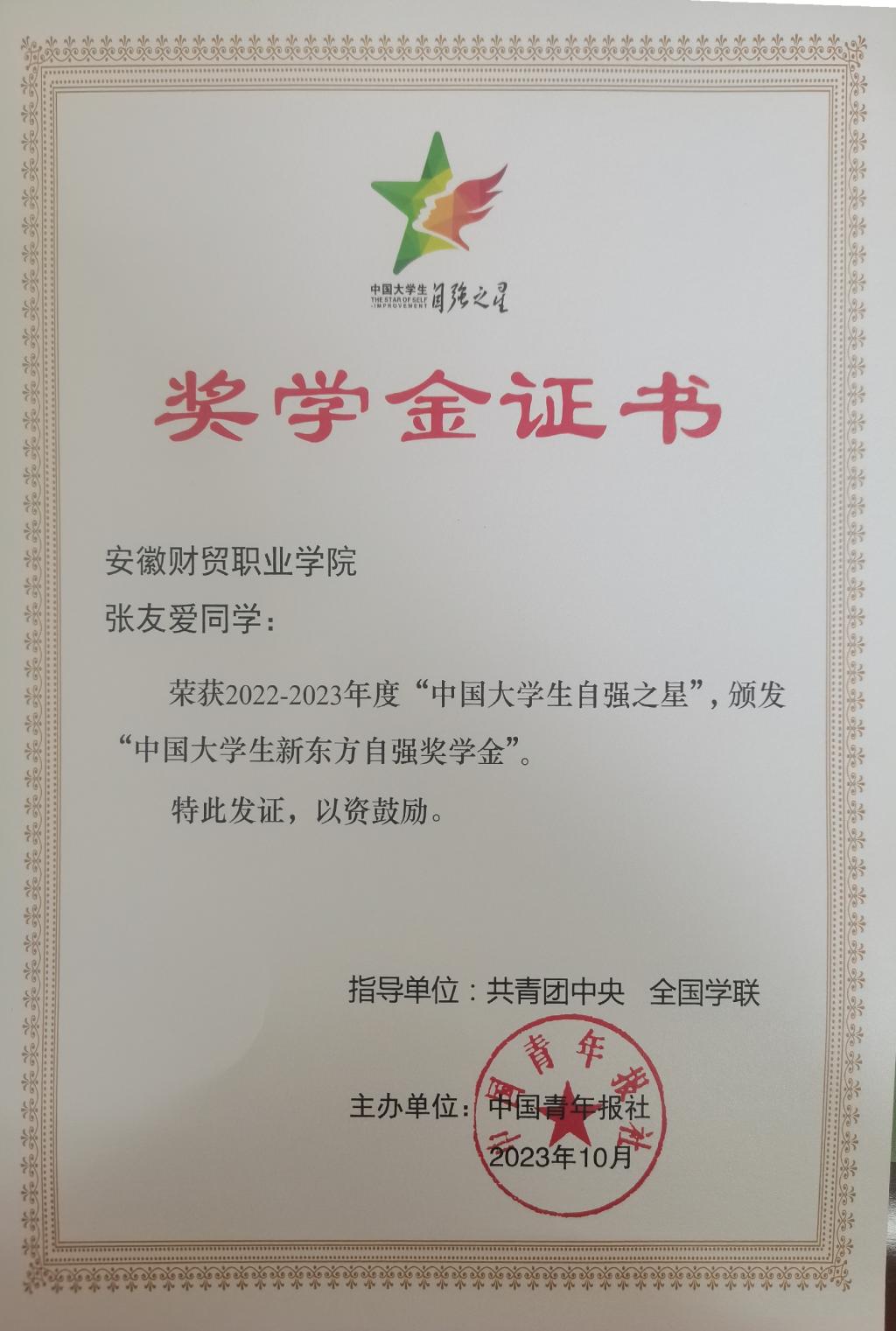 近日,由共青团中央、全国学联指导,中国青年报社开展的2022-2023年度“中国大学生自强之星”奖学金评选活动中,我校计应2001班张友爱同学荣获2022-2023年度“中国大学生自强之星”,获得“中国大学生新东方自强奖学金”。