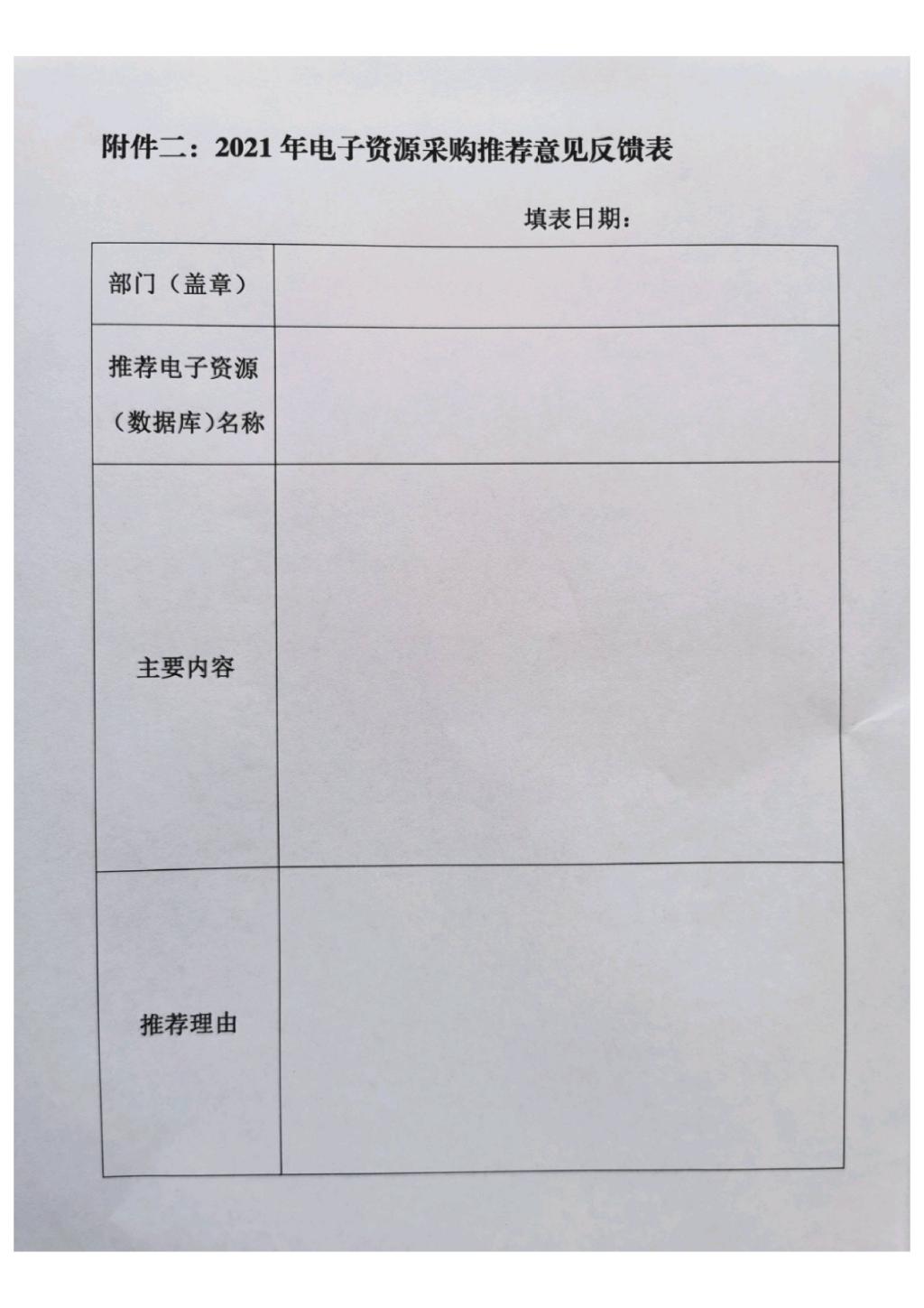 电子资源建设是学校人才培养和学科建设的重要支撑和保障,在学校教育事业发展中发挥了越来越重要的作用。为提高2021年电子资源采购预算经费使用效益,切实增强电子资源采购的针对性和适用性,图书馆现启动2021年电子资源建设项目征集工作,在全校范围内征求各单位对2021年图书馆电子资源订购的需求和建议。图书馆现将2020年的电子资源列表(附件1)发送至各单位,以供参考。