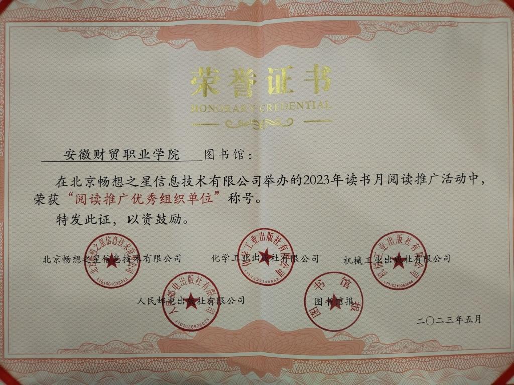 近日,由安徽省高等学校图书情报工作委员会和安徽省高等学校数字图书馆主办,北京畅想之星协办的2023读书月活动之“最美四‘阅’天·组队‘悦’好书”为主题的线上读书活动,全国共有1039家图书馆的32927名读者参与,安徽赛区共66家图书馆5364名读者参与,此次活动中学校图书馆荣获“阅读推广优秀组织单位”称号。
