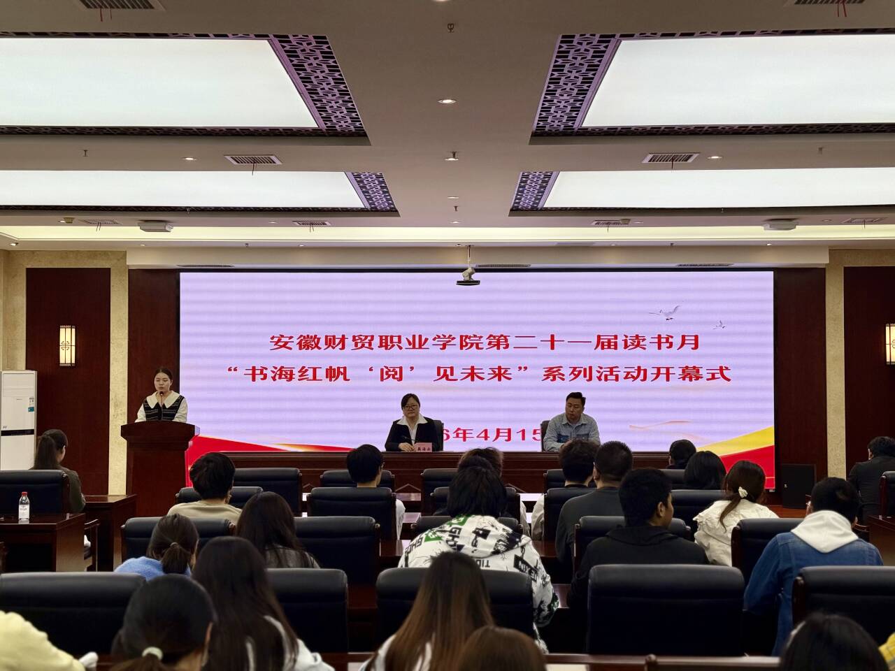 4月15日中午,学校第二十一届读书月“书海红帆 ‘阅’见未来”系列活动开幕式在行政楼311会议室举行,团委副书记刘成应邀出席,图书馆工作人员、学生代表参加。