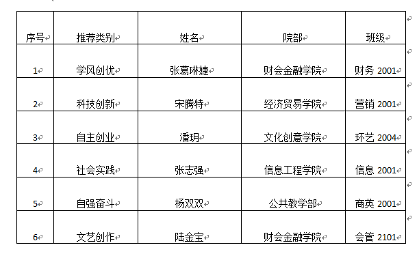 根据《关于开展 2022 年安徽省“‘十佳’‘百优’大学生”选树工作的通知》(皖青联〔2022〕42 号)要求,经个人自荐、二级院部遴选推荐和校级评审等环节,学校开展了2022年安徽省“‘十佳’‘百优’”大学生”校内选树工作。现将拟推荐参评的候选人予以公示,名单如下:
