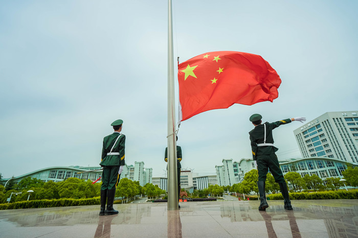 迎着立夏之际,迎着朝阳乘着微风,参与人员准备就绪,在全体师生的注目礼下,英姿飒爽的国旗护卫队队员们护送鲜艳的五星红旗进场,行礼完毕,伴随着庄严的中华人民共和国国歌,五星红旗冉冉升起,迎风飘扬。在场的每一个人向国旗行注目礼,表达对祖国的热爱和崇高的敬意。
