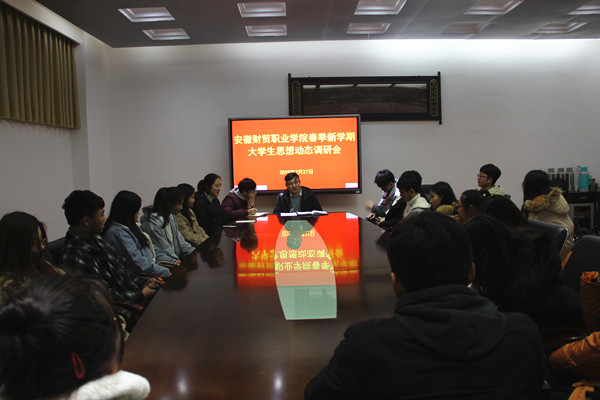 为及时了解大学生寒假期间及返校后的思想动态,进一步加强学生思想政治教育工作,更好地引领和服务青年大学生的思想和成长。2月27日下午,学校团委在行政楼第三会议室召开新学期大学生思想动态调研会,各团学组织干部、社团成员代表、普通学生代表参加会议,座谈会由学院团委老师吕林全主持。