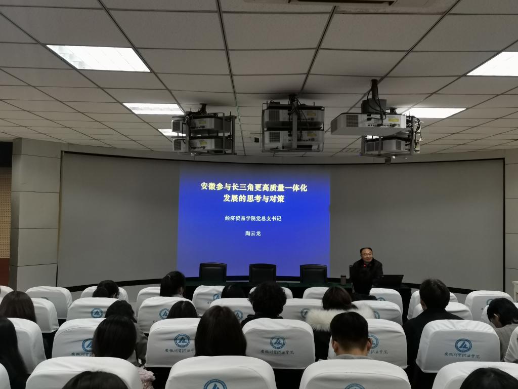 12月2日下午,“青马工程”培训班迎来了开班第三讲---《安徽参与长三角更高质量一体化发展的思考与对策》,学院团委特别邀请经济贸易学院党总支书记陶云龙作为本次报告会的主讲人,80余名“青马工程”培训班团学骨干悉数到场。