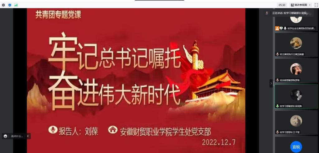 12月7日下午,2022年“青马工程”大学生骨干培训班第三场专题报告会如期线上召开,会议特别邀请学生处处长刘葆作题为《牢记习近平总书记嘱托,奋进伟大新时代》的专题报告。2022年校院两级“青马工程”培训班全体学员参加。