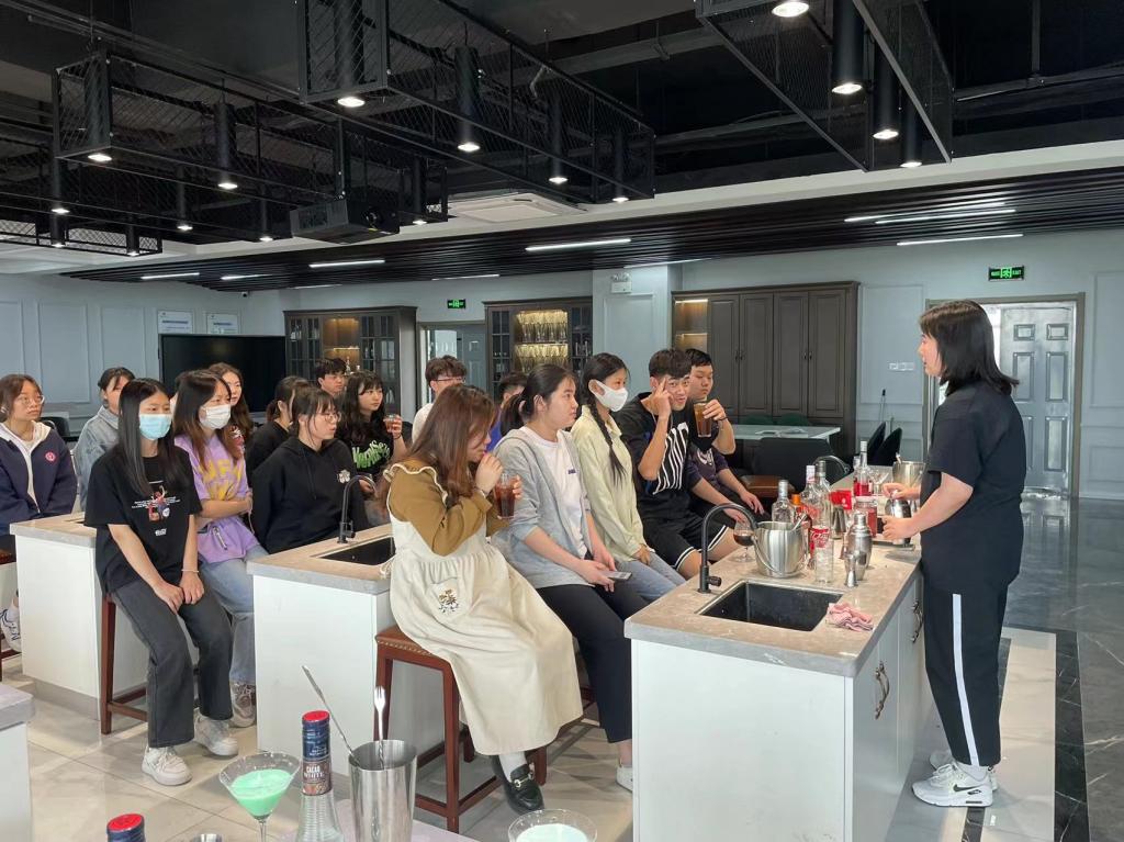 “魔幻指尖——调酒技能展示”活动中,同学们不仅展示了特基拉日出、燃情百加得、彩虹酒等经典鸡尾酒,还进行了自创鸡尾酒的调酒展示。通过调酒实操技能比拼和展示,同学们掌握了更多的酒水文化和调酒技巧,进一步提升了职业技能。