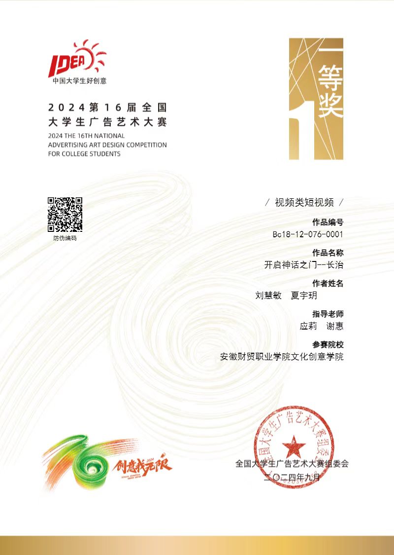 近日,经过激烈的角逐,在第十六届全国大学生广告艺术大赛中,动漫设计专业学生刘慧敏、夏宇玥创作的短视频《开启神话之门——长治》喜获国赛一等奖,实现我校在该赛项国赛历史性突破。