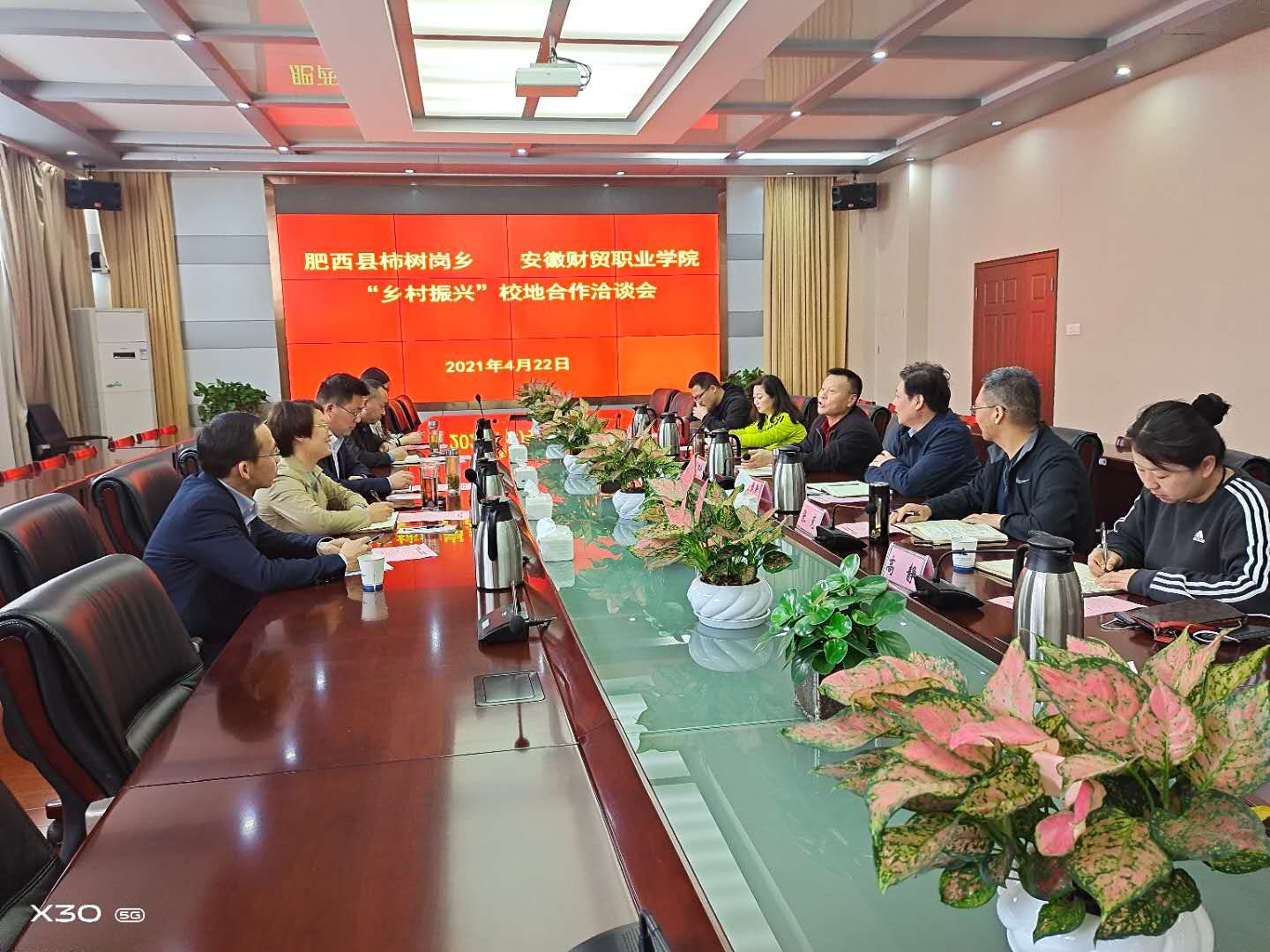 4月22日下午,肥西县柿树岗乡党委书记何欣欣率队来院就“乡村振兴”校地合作进行洽谈。学校党委委员、副校长胡戴新出席洽谈会。文化创意学院相关人员陪同调研。