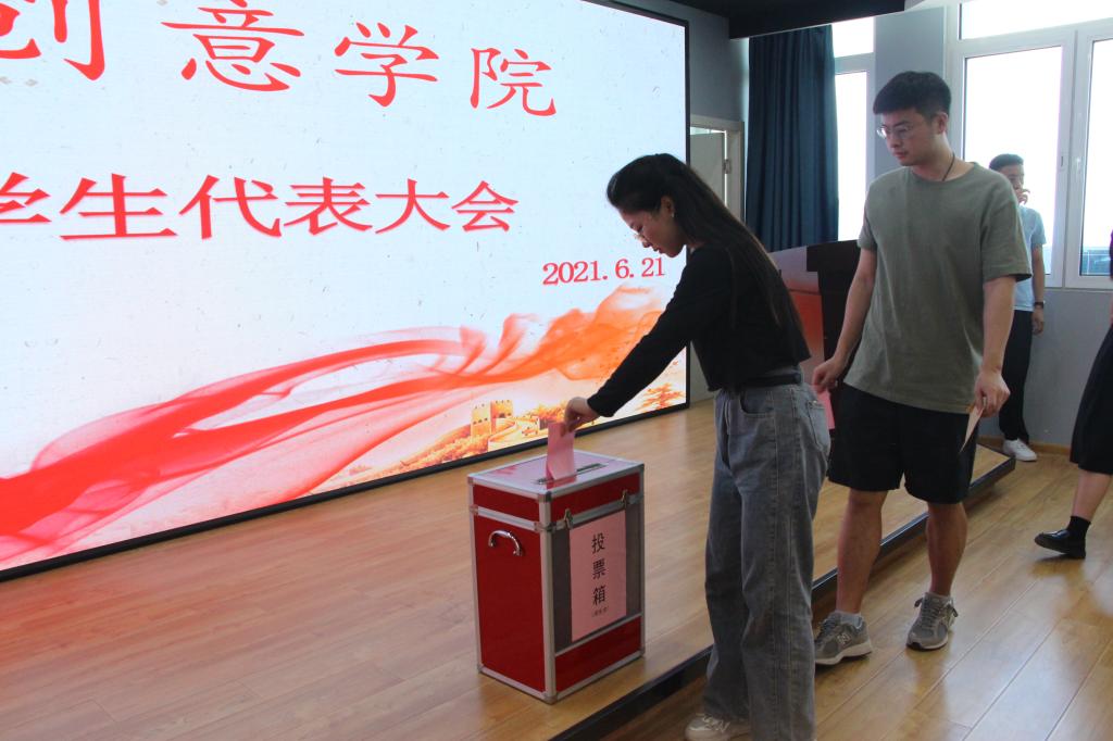 在主持人公布选举办法、候选人、监票人、计票人名单、候选人产生情况说明等事项后,选举正式开始。各位代表认真阅读候选人简介,履行自己的职责,公平公正地进行选举投票,通过差额选举产生了文化创意学院第二届学生会成员。大会在振奋的团歌声中胜利闭幕。