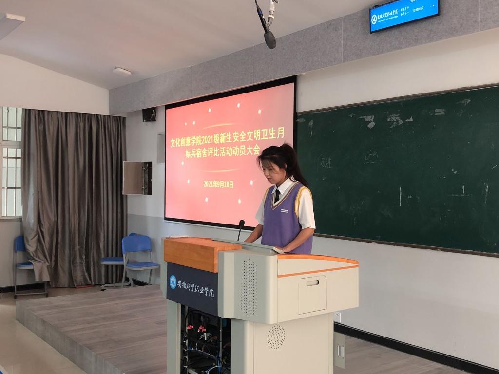 酒店2002班汪靖雯、智慧旅游技术2101班江周分别作为标兵宿舍寝室长代表和新生代表发言,他们表示会在接下来的活动月中,发挥模范带头作用,带动团学干部、班级同学共同整理好宿舍卫生,提升寝室文化。