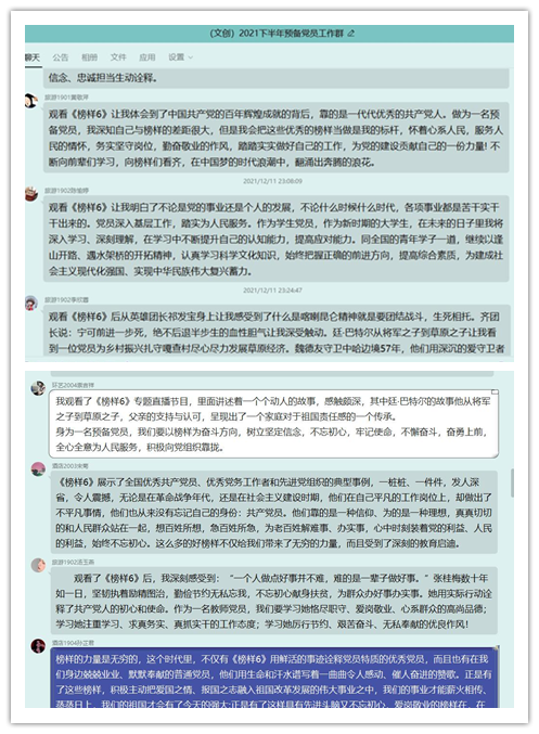 为深入学习贯彻习近平新时代中国特色社会主义思想,充分发挥先进典型示范引领作用,大力宣传“七一勋章”获得者和全国“两优一先”表彰对象的典型事迹,12月8日,文化创意学院组织学生预备党员观看建党100周年特别栏目《榜样6》,其他入党积极分子通过电视、网络直播、移动终端等多种方式收看。