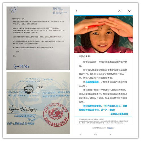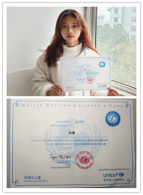 近日,文化创意学院学生宋菊收到联合国儿童基金会驻华代表芮心月的感谢信及由她本人签署的联合国儿童基金会月捐证书。