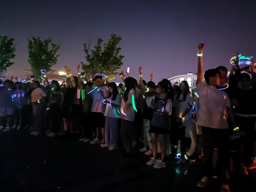 夜幕下,同学们手持荧光棒、戴着荧光头箍聚集在文化广场,跟着音乐节拍,开始跑前热身,大家用热情和缤纷色彩点亮校园,在奔跑中积蓄力量,洋溢着青春的气息,体验着健康奔跑的乐趣,涌动的人群形成了一道道的亮丽的风景线,演绎了一场奔跑的青春。