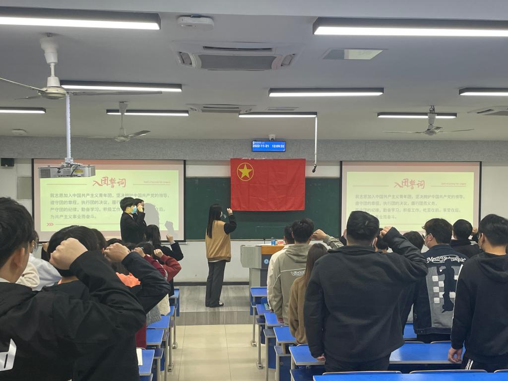 在庄严肃穆的国歌声中,2022年新团员入团宣誓仪式正式开始。仪式上,刘凯宣布了发展新团员的审批决定和新团员名单。老团员代表杨延萍带领新团员进行了入团宣誓,新团员们将右拳举起过肩,面对团旗庄严宣誓,话语铿锵有力;新团员代表龚志鹏作表态发言,承诺将会努力使自己成为一名优秀的共青团员,在学习、劳动中起模范带头作用,用热情去带动和影响周围的同学,传递正能量,不负青春,不辱使命。刘凯对新加入中国共产主义青年团的同学表示了祝贺,同时也提出了殷切的期望,并要求全体团员思想坚定、学习勤奋、积极奉献,用实际行动为团旗增光,为校园添彩。最后在昂扬的共产主义青年团团歌声中,整个仪式圆满结束。