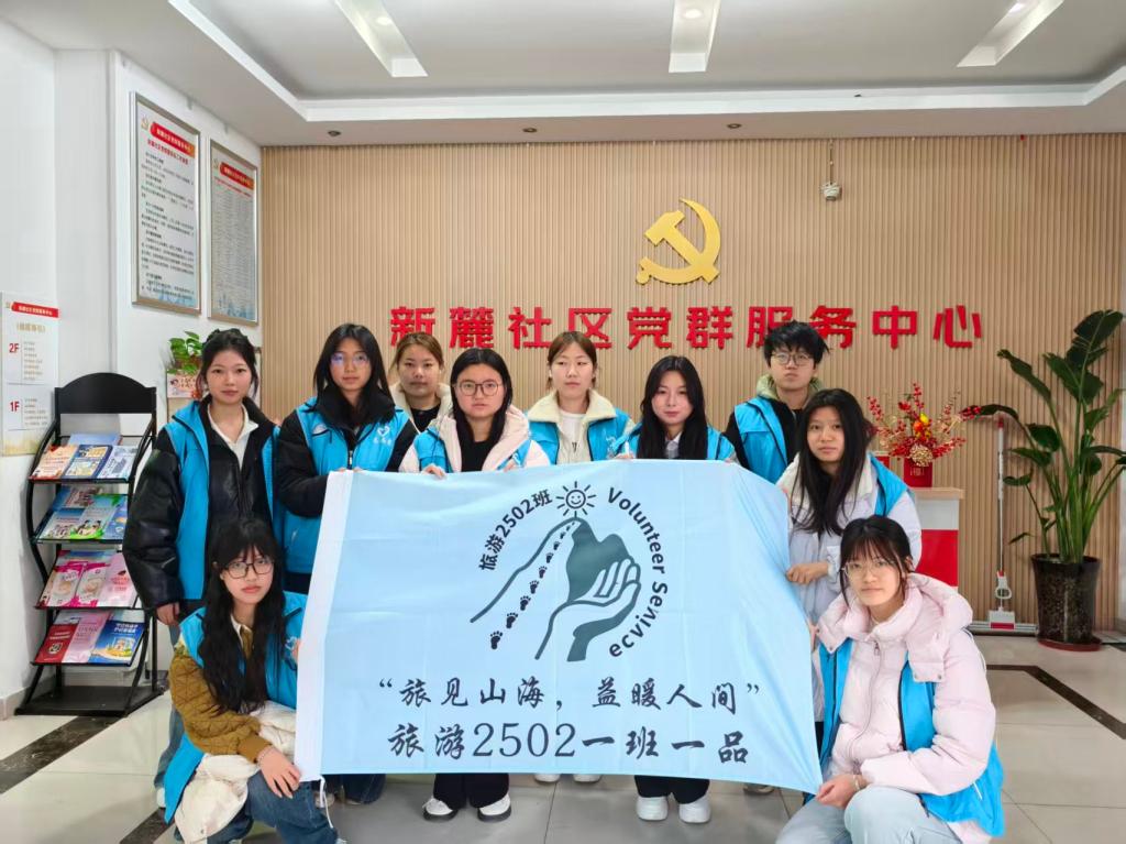 文旅融合践初心,志愿服务暖民心。旅游2502班团支部以“旅见山海,益暖人间”为品牌内核,组织20名青年志愿者走进新麓社区、高新社区开展“双走进”服务。在党员教师指导下,志愿者们走访慰问独居老人和困难家庭,同时发挥专业优势,将旅游策划、新媒体运营知识转化为实践力量,协助社区拍摄宣传短视频,获社区负责人高度评价,为社区宣传注入青春活力。