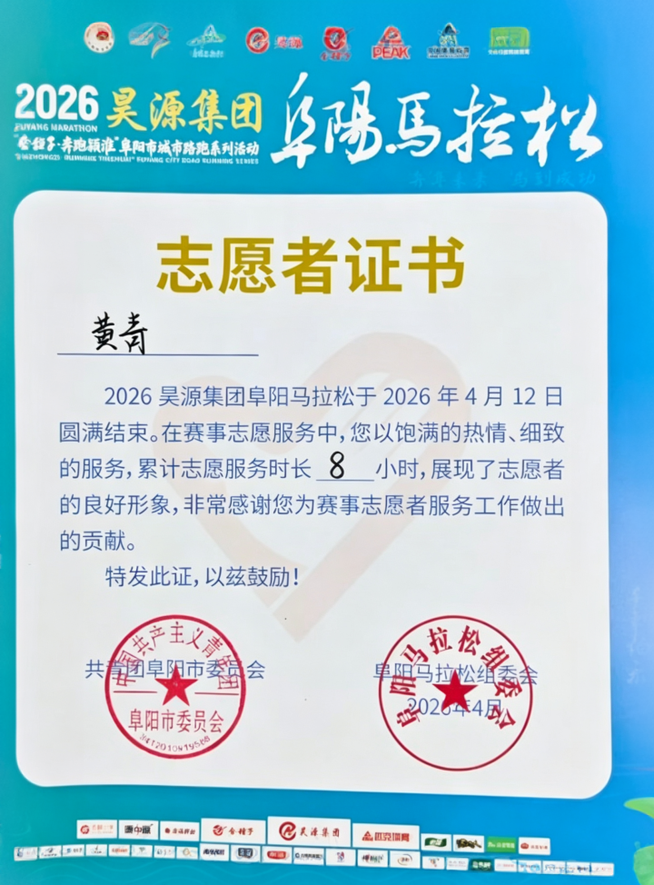 近日,文化创意学院动漫2502班黄青同学圆满完成2026阜阳马拉松志愿服务,荣获共青团阜阳市委员会、阜阳马拉松组委会联合颁发的“志愿者证书”,彰显了我院青年学子在党建带团建引领下的责任与担当。