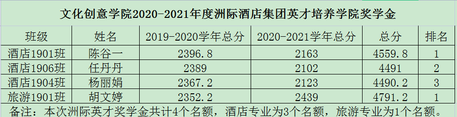 2019级洲际人才班共有11名学生申请本次奖学金,按照“洲际酒店集团英才培养学院奖学金”的资助管理工作办法及规则,评选出酒店1901班陈谷一、酒店1906班任丹丹、酒店1904班杨丽娟、旅游1901班胡文婷四位同学获得本次奖学金。