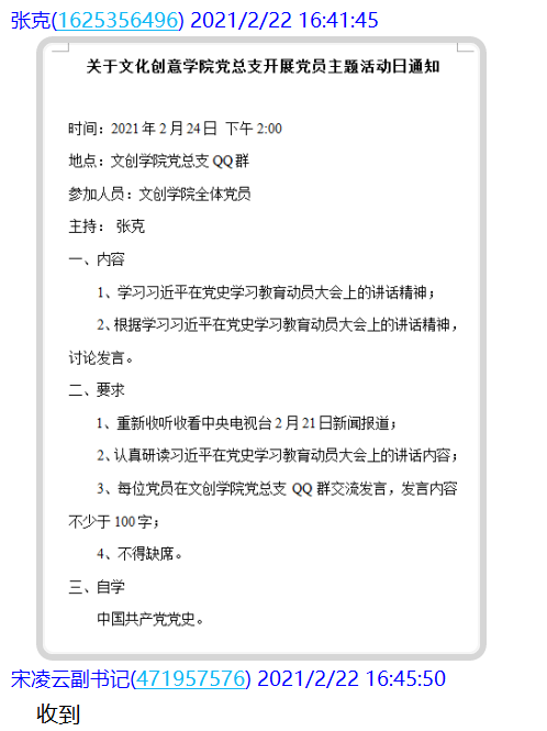 2月24日下午,文化创意学院党总支利用假期时间,在线召开《习近平在党史学习教育动员大会上的讲话精神》学习研讨会,党总支书记张克主持会议,全体党员老师参加线上会议。