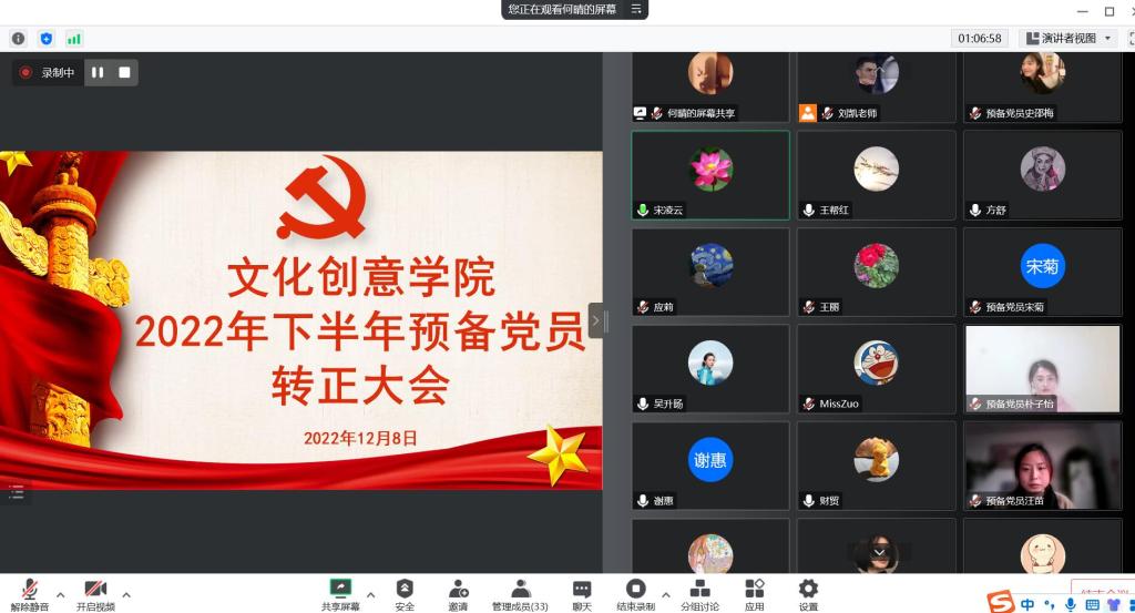 12月8日下午,文化创意学院学生党支部召开线上预备党员转正大会,大会讨论了关于预备党员卞青倩等12位同志的转正问题。学生党支部书记宋凌云同志主持会议,支部全体党员及预备党员培养联系人参加会议。