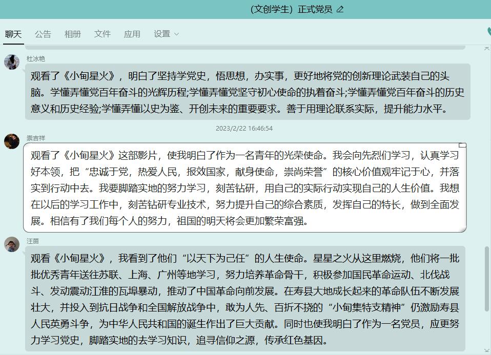 按照《中共省委组织部关于做好二十部优秀党员教育电视片学习使用工作的通知》要求,利用“三会一课”、集中研讨等形式,组织基层党组织和广大党员学习收看20部优秀党员教育电视片。2月22日,文化创意学院学生党支部组织教师党员线下观看优秀党员教育片《小甸星火》,学生党员线上参与并展开集中研讨。