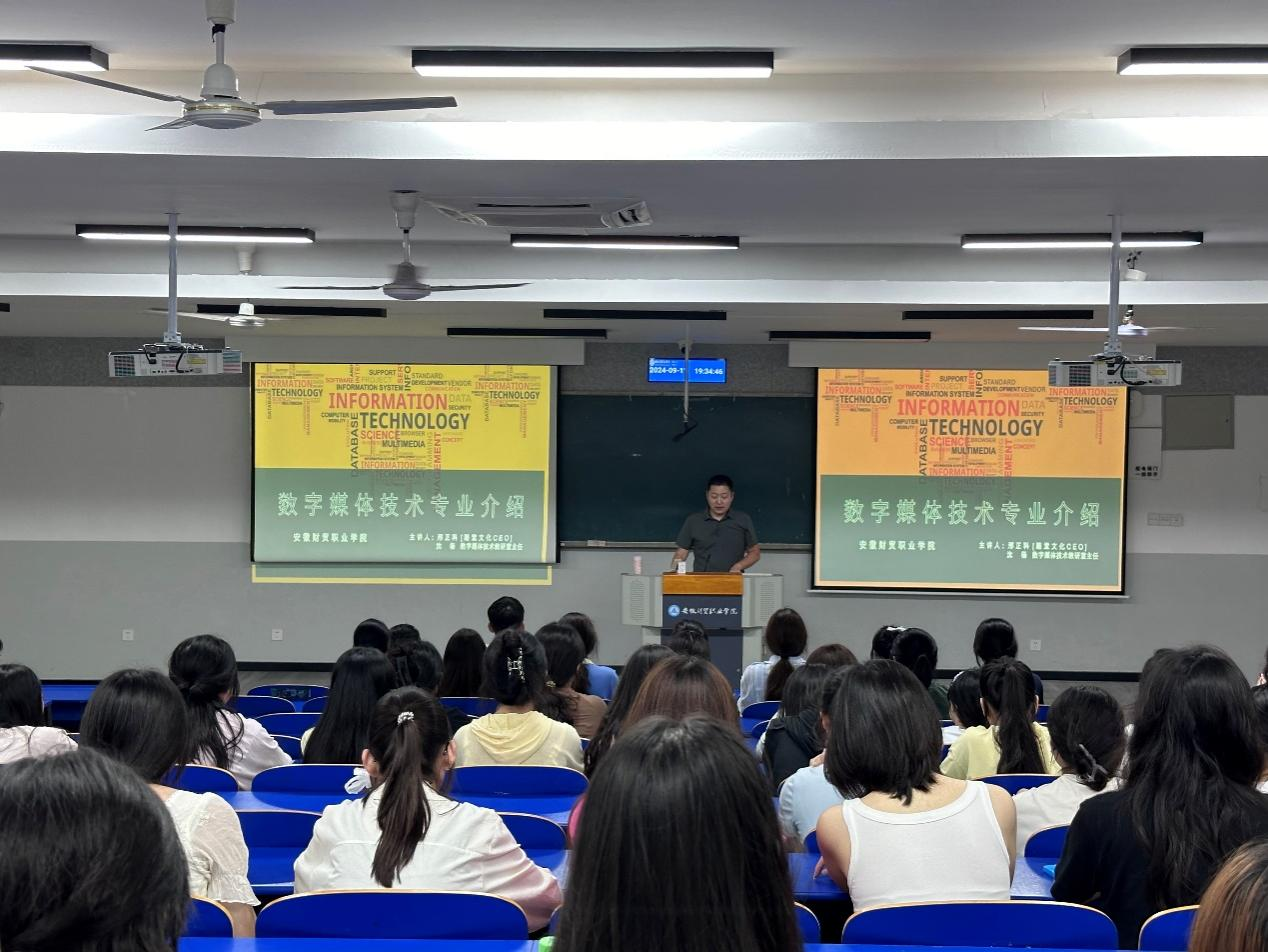9月11日晚,未来技术学院在教学楼6202教室开展数字媒体技术专业2024级新生专业教育。酷堂文化传播有限公司总经理邢正科和数字媒体技术教研室主任沈杨担任主讲,部分专业教师和数字媒体技术专业2024级全体学生参加。